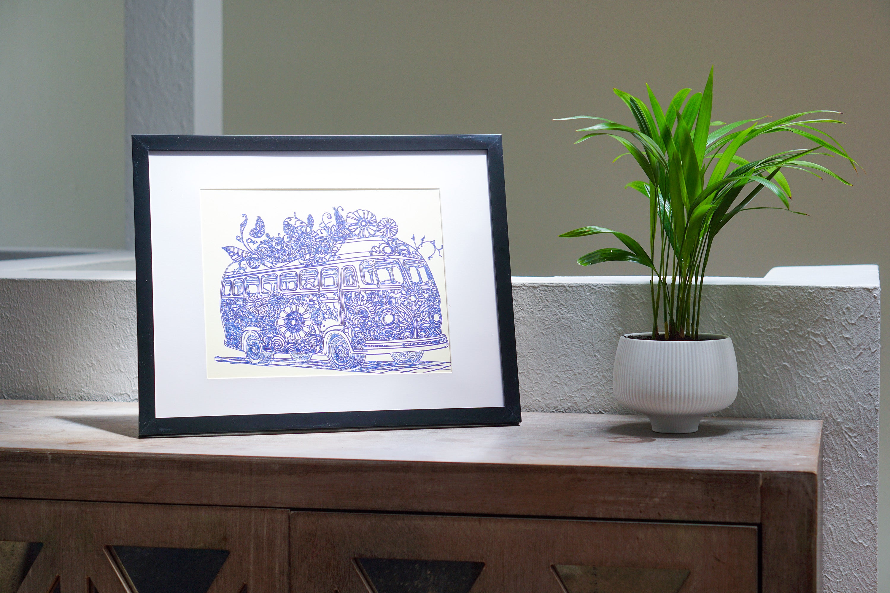 Vintage Elegance: Ornate Classic Bus Blue Ink Artwork